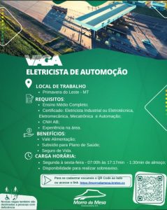 A Concessionária Morro da Mesa anunciou, nesta semana, a abertura de vagas de emprego em Primavera do Leste. As oportunidades são para Auxiliar de Serviços Gerais e Eletricista de Automação.